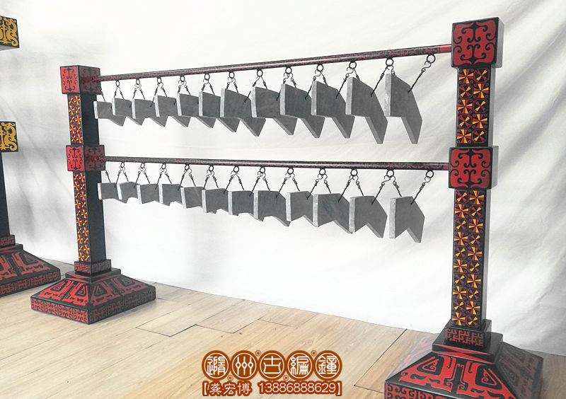 公司復(fù)原制作的24音編磬全長1.8米,寬50厘米,高1.1米;演奏方便,音色亮麗,公司設(shè)計了編磬木桌放置編磬,長2米,高70厘米,寬60厘米,陳列編磬后總高度:1.8米。木桌內(nèi)做儲藏柜,可方便樂隊保管其他樂器及服裝,方便實用。